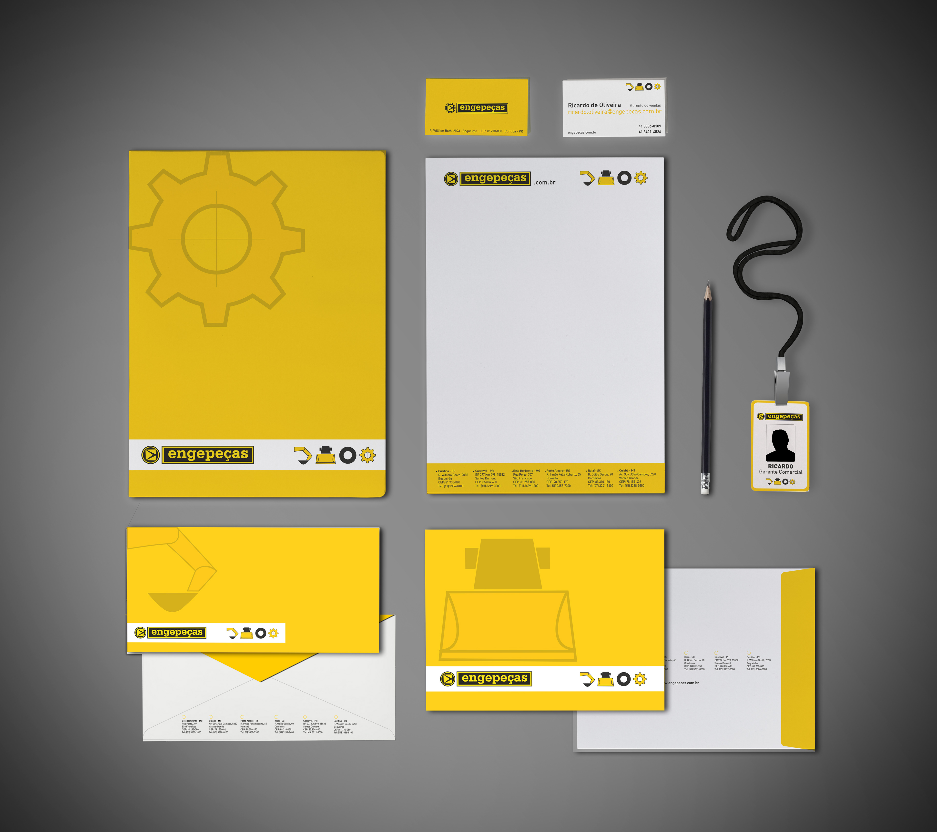 Projeto de papelaria para a Engepeças. Agênica: Fuego Ano: 2013 -------------- . Envelope . Crachá . Pasta . Papel Timbrado . Cartão